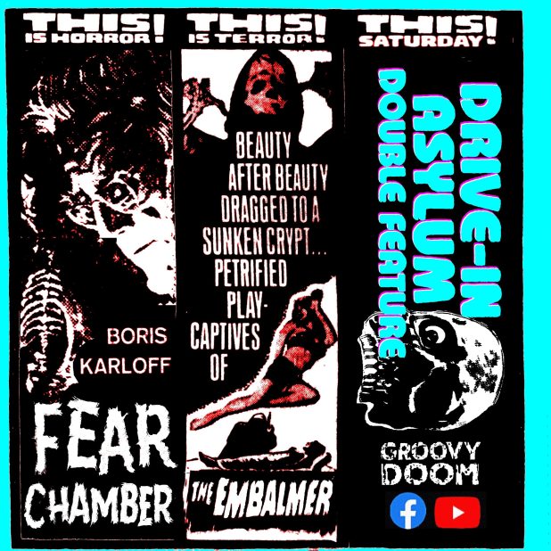 This Saturday on the Groovy Doom Facebook and YouTube channels at 8 PM EDT, join us for two bizarre screamers from the late 60s, Fear Chamber (AKA Torture Zone) and The Embalmer (AKA The Monster of Venice). They may have been lurking on the outskirts of your awareness, waiting for the right time to pounce on you – well, that time is NOW! Be there!