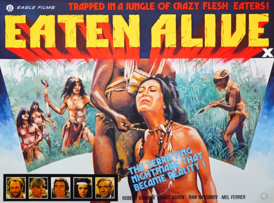 PS – Amazingly, it wasn’t until I read this review that I learned that Eaten Alive was three different movies — Jungle Holocaust, The Man from Deep River and Mountain of the Cannibal God (look for that in a few days!) — along with some Jim Jones thrown in.