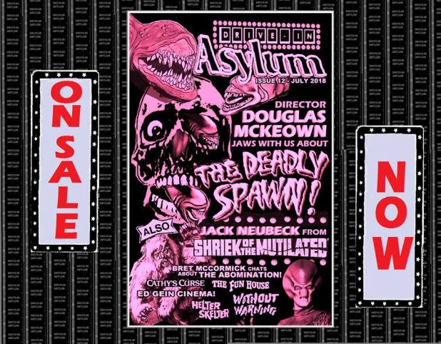 Each issue of DRIVE-IN ASYLUM comes with a 4×6 matte print of a random vintage movie ad, and we’ve also got some fantastic die-cut DEADLY SPAWN stickers, too — but the number of SPAWN stickers is limited, so order early to be sure you get one!