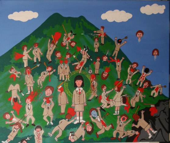 As the three enter Kitano’s base they find an unhinged painting of the entire class, all foretelling how they would die, with only Noriko as the sainted survivor, painted as if she has ascended to godhood.