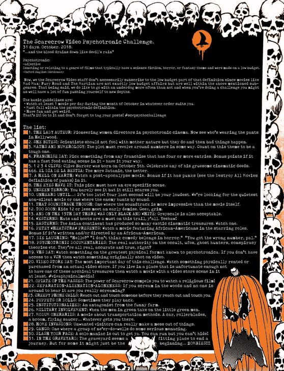 The goal is to watch one film every day that fits the 31 entries on the list provided by Scarecrow Video. Here’s the list below. If you’re reading this and love movies, you should take the challenge, too!