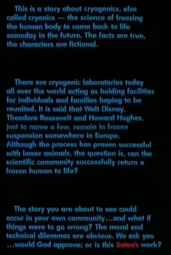 Should you watch it? That depends. Have you seen Return of the Living Dead and always wanted someone to make a way worse version of it, but also confuse the plot with the moral dilemma as to whether freezing someone after death is right or wrong? Then good news! This one has you covered!