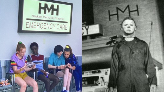 5. The logo for Hawkins Memorial Hospital looks like Haddonfield Memorial Hospital in Halloween 2 (1981): There’s no mistaking the fact that the inspiration for the hospital scenes, particularly when the possessed staff of the Hawkins Post stalks Nancy Wheeler. The lighting, the hallway, the frantic elevator button pushes — I was waiting for someone to throw an oxygen tank at a demogorgon and have it bleed out of the eyes.