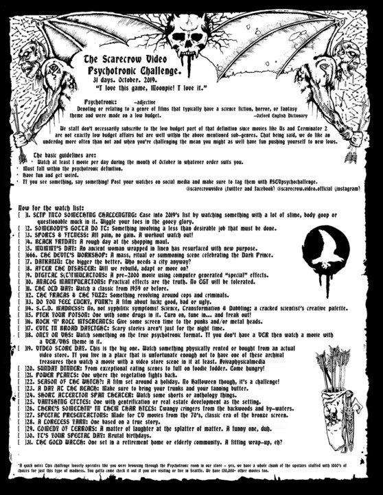 On that trip, I learned about the Scarecrow Challenge — 31 days of psychotronic movies — and I made it! Doing the Scarecrow Challenge — you can relive mine on our site or on Letterboxd — taught me a ton about movies and inspired plenty of further explorations. I can only hope for the same this year.