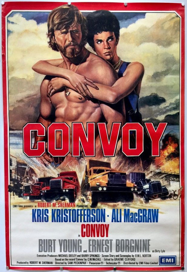 Somwhere in the Arizona desert, truck driver Martin “Rubber Duck” Penwald (Kris Kristofferson, pretty much the most attractive man to ever drive an 18 wheeler) is passed by Melissa (Ali McGraw, a woman able to break the hearts of both Robert Evans and Steve McQueen, but once you see her in this film you’ll say, well, yes, I understand how they could throw caution to the wind and ruin their lives for Ali McGraw; PS — I learned pretty much 99% of my writing style from The Kid Stays In The Picture), a photographer who gets him in trouble with his arch enemy Sheriff “Dirty Lyle” Wallace (Ernest Borgnine, The Devil’s Rain!). It turns out that the Rubber Duck has been pulling his rig into the driveway of Lyle’s wife Violet (Cassie Yates, who we all know and love from Rolling Thunder) if you know what I’m driving at.