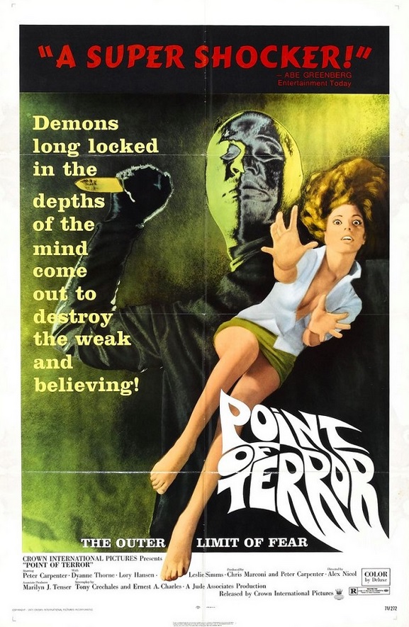 As the duo began working on their third sexploitation-horror romp, Middle of the Night, Carpenter suffered a cerebral hemorrhage and died* shortly after the release of Point of Terror. He made his acting debut in Russ Meyer’s Vixen! (1968) and, back in the days when X-Rated dramas were “chi-chi to see” and advertised in the movie sections of mainstream-commercial newspapers, costarred with Dyanne in the hit Swedish sex-romp, Love Me Like I Do (1970). After making his screenwriting debut with Blood Mania, Carpenter and Thorne costarred in his second feature, Point of Terror.
