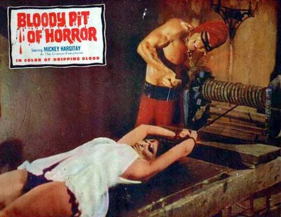 I am not going to detail the film any more because I want people to see it. I will say that the owner of the castle clearly has come to identify with the Crimson Executioner and has the same psycho feelings of great moral and physical godlike qualities. He is played by none other than Mickey Hargitay, in his first film role. He is an exceptional physical actor. He is all too often thought of as a “musclehead” as I read from one reviewer, but bodybuilding was a sport he came to after he had already been part of a famous acrobatic team as a young boy, a championship speed skater and a football player. In the final scenes in the torture chamber, as he cavorts around finishing off the hapless members of the poor photo shoot, he is so graceful and has a fierce presence. It made me think of rock star videos such as Billy Idol’s “Dancing With Myself,” except much more powerful. Some critics have called the film homoerotic, due no doubt to the Crimson Executioner’s obsession with physical perfection. But at several points in the film he exhibits disgust for mere mortal love and lust. I think this film is a study in narcissism and its relation to extreme sociopathy.