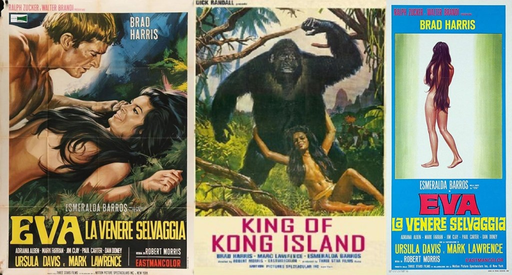 Instead of galactic time travel, we get an Island of Dr. Moreau-styled mad scientist in Kenya experimenting with radio transmitter brain implants to control a tribe of island-dwelling gorillas, so as to turn them into a take-over-the-world army. As with The Mighty Peking Man—which lends to the plot confusion—the “Eva” of the title helping in the adventure is a loin-clothed, Tarzan-like jungle girl with a pet chimpanzee who can talk with the animals. Of course, all mad scientists are horny, so those dreams of world conquest unravel when he instructs the radio-controlled apes to kidnap his dream girl, the daughter of the owner of a local Nairobi gin-joint (yes, the classic Casablanca is pinched as well). And with that, Rick Blaine, I mean, Burt Dawson (American expatriate actor Brad Harris), an Indian Jones-styled adventurer, comes to the rescue.