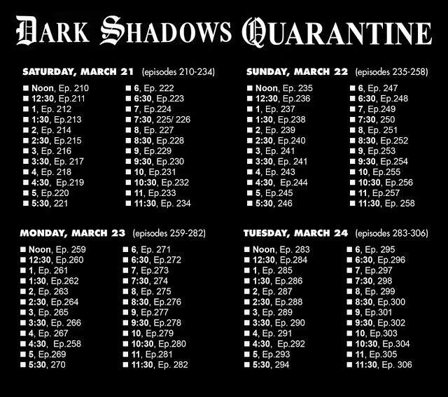 According to the site: “Beginning every half hour on Saturday at noon, Eastern Standard Time, we’re going to watch an episode of Dark Shadows … beginning with episode 210. From there, it will be a block of 24 episodes ending at midnight. Join other fans on Twitter to talk about these episodes live, using the hashtag #DarkShadows. Here’s a schedule of episodes for the first four days. You can follow me online at @CousinBarnabas and Patrick McCray at @TheRealMcCray. (This whole thing was his idea!) And don’t forget the hashtag … that’s how other Dark Shadows fans will find you. The schedule below will allow you to drop in and out of the event as you please.”