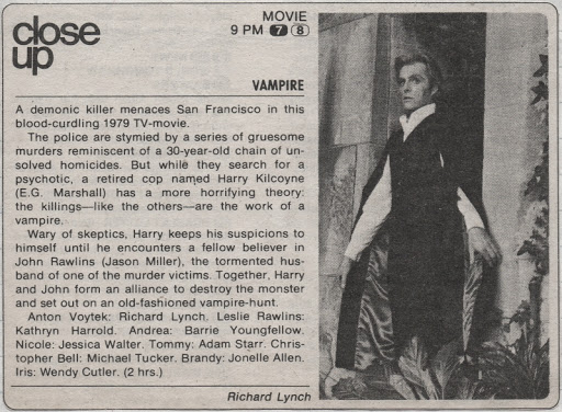Richard Lynch stars as Anton Voytek, a handsome millionaire vampire who has used his undead power over women for centuries before coming into the orbit of vampire hunters John Rawlins (Jason Miller from The Exorcist, ironically the father of two future vampires: Joshua John Miller played Homer in Near Dark and Jason Patric was Michael in The Lost Boys) and E.G. Marshall.