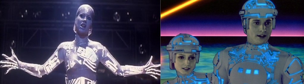 Well, we all know about the debated relationship between Jack Wood’s Equinox and Sam Raimi’s The Evil Dead, right? Well, check out this shot of Hazel O’Connor’s “robot” from the “Eighth Day” segment of Breaking Glass against an image of 1982’s TRON.