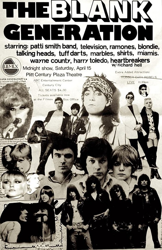 That first film, 1976’s The Blank Generation (again, carrying the grammatical article prefix), is a 16-mm black & white DIY documentary co-directed by Lydia Lunch and Patti Smith Group guitarist Ivan Kral and “No Wave” director Amos Poe (who went mainstream with 1984’s Alphabet City; starred Vincent Spano of Over the Edge, Matt Dillon’s first film). That film features grainy, live performances by Patti Smith, Blondie, Television, the Ramones, Talking Heads, the Heartbreakers, the Shirts (fronted by Annie Golden, later of Susan Seidelman’s 1985 Madonna-starring, Desperately Seeking Susan), Wayne County, and the Tuff Darts (featuring soon-gone original lead singer Robert Gordon) on the stage of CBGBs.