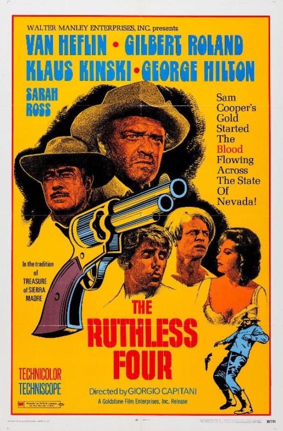 The title — and alternate titles — of this one pretty much says it all: Four men embark on a suicide mission for a fortune in gold from a mine owned by Nevada prospector Sam Cooper (Van Heflin). Always the heavy, Kinski is one of the greedy four, Brent the Blonde, a faux-preacher with blood on his hands . . . and one more body means nothing to him.