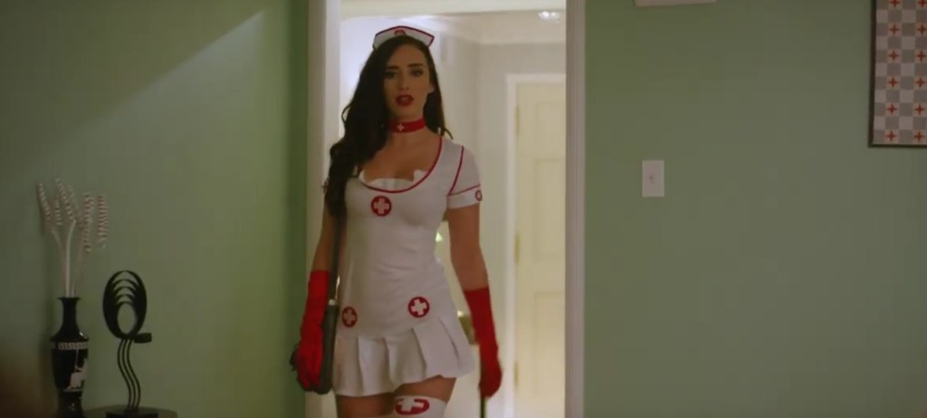Now, Eddie’s a good boy. He loves his to-be wife (well . . .). And that means, to the chagrin of his buddies: no strippers. But a slutty nurse-uniformed Courtney shows up — that none of Eddie’s buddies invited. And guess who’s hooking up (emotionally, natch) with the stripper: Eddie. And Eddie confides to Courtney that, while he loves Jenny, he’s hot for his friend Kim, a fellow teacher.