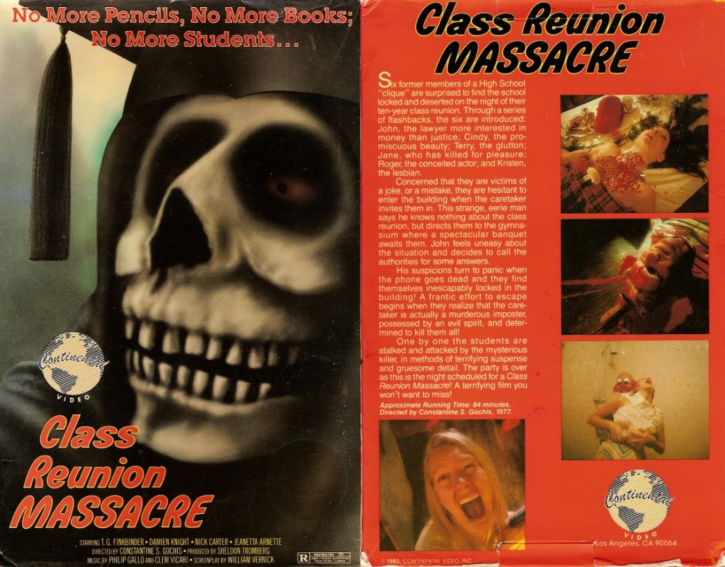 You can watch it with-ads on Tubi Tv or ad-free on You Tube. If you want it in the library: Copies of the 1985 VHS original released by Continental Video and the VHS re-issues via Victory Media in 1995 are can be found in the online marketplace. There are two versions of the DVD out there: Code Red’s October 2010 release (also as a Blu) as The Redeemer and Desert Island Films put it back into the marketplace under the old VHS Class Reunion Massacre title in 2012.