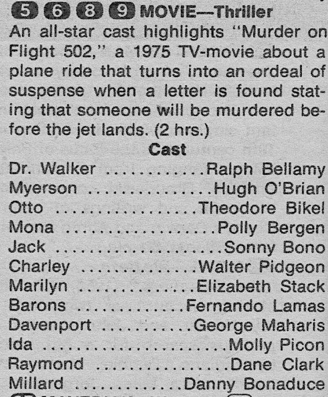 ABC-TV wasn’t letting those Airport (“Exploring: Airport, Watch the Series“) theatrical blockbusters slip by them without a TV movie knockoff, this one by the ’70s production dynamic duo of Leonard Goldberg and Aaron Spelling. Critics pounced on the film’s special effects, sets, and stock footage ineptitude on a low budget, but it cleaned up on the advertising front as it placed in the Top 10 shows during the week of November 21, 1975.