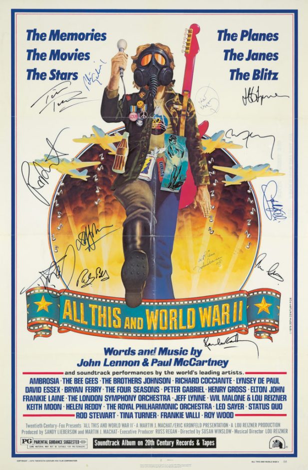 Imagine: 20th Century Fox films and newsreels of World War II, scored in a satirical way by The Beatles. Or their songs, at least. Tony Palmer, who directed 200 Motels with Zappa and All You Need Is Love: The Story of Popular Music, would fit it all together (Susan Winslow is also credited as director). And The Bee Gees would record all of the music.