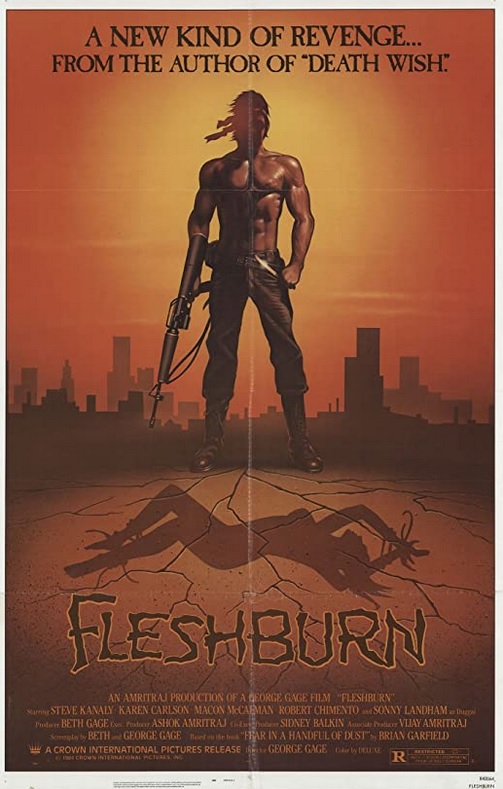 For the younger, modern audiences: you’ve seen Garfield’s official Death Wish sequel, 1975’s Death Sentence, turned into the 2007 James Wan-directed and Kevin Bacon-starring film of the same name (but the film does not pick up the Death Wish-film timeline, nor follows the book’s plotting). And you know the quintessential, crazy dad flick, The Stepfather (1978) and its sequels in 1989 and 1992: those began with an unpublished story turned into a screenplay by Garfield. And again, I remember the newspaper and TV ads for The Last Hard Men and Hopscotch — and seeing both in theaters — but not Fleshburn, which was based on Garfield’s 1978 novel, Fear in a Handful of Dust.