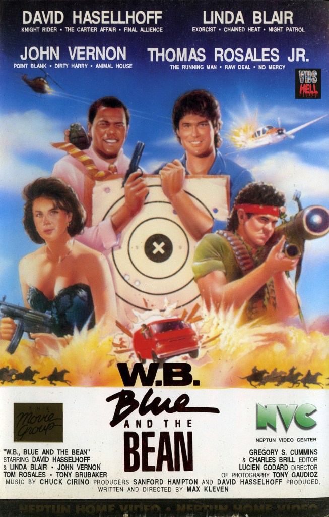 Okay, so what’s with the dopey W.B, Blue and the Bean title? Ah, it’s the kitschy kharacter names of the story: White Bread (Hasselhoff), Blue (stuntman Tony Brubaker), and Bean (Thomas Rosales Jr. from Speed and Running Scared). They’re three ne’er-do-well bounty hunters hired to protect Blair’s richy-bitchy, natch, snob — who just witnessed her playboy-cum-drug-dealing boyfriend murdered by his Columbian connection. So, if you want to see Blair sportin’ a white cleave gag in a dusty ol’ Mexican farmhouse — and what growing young lad doesn’t — then this is your movie. Will our bounty-trio save her to make it to court to testify?
