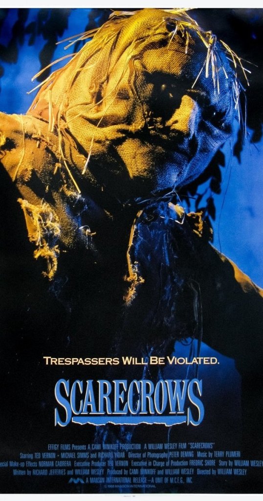The planned theatrical release of the film fell part when the distributor, Manson International Pictures, went bankrupt; however, the film returned $3 million on the home video market under the well-known Orion Pictures banner. Manson is a name you know, as the studio also gave us Terror at Red Wolf Inn (1972), Star Knight (1985), Brain Damage (1988), and Slaughterhouse Rock (1988), just to name a few of the 80-odd films in their catalog. All of those films — only to go under upon the release of Scarecrows.