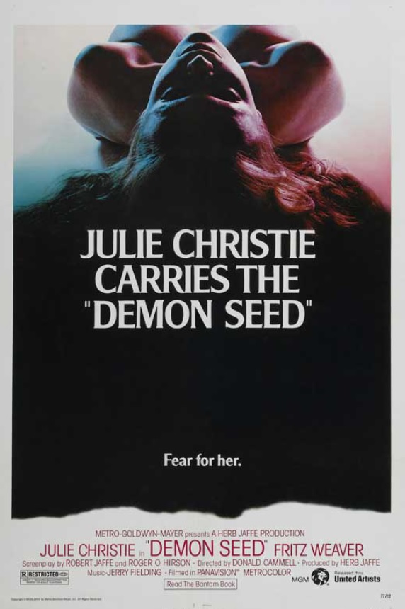 Critics across the board hated this debut book-to-screen adaptation of Dean Koontz’s 1973 novel (Watchers, Servants of the Twilight) of the same name, which was written off as a sci-fi version of Roman Polanski’s Rosemary’s Baby — only with a “satanic” computer (the book was a best seller; when the movie came out in ’77, the book was reissued; Waldenbooks promoted the book/film via an advertisement on its carryout paper bags). Released during the same year as Star Wars and Close Encounters of the Third Kind, Demon Seed, sadly, wilted at the box office. The director, Donald Cammell, was a protégé of Nicolas Roeg (the big budget American Giallo Don’t Look Now, also starring Julie Christie); the duo worked together on the Mick Jagger-starring Performance (completed in 1968, released in 1970). Cammell faired better with the pre-Basic Instinct psycho-thriller White of the Eye (1987) starring David Keith.