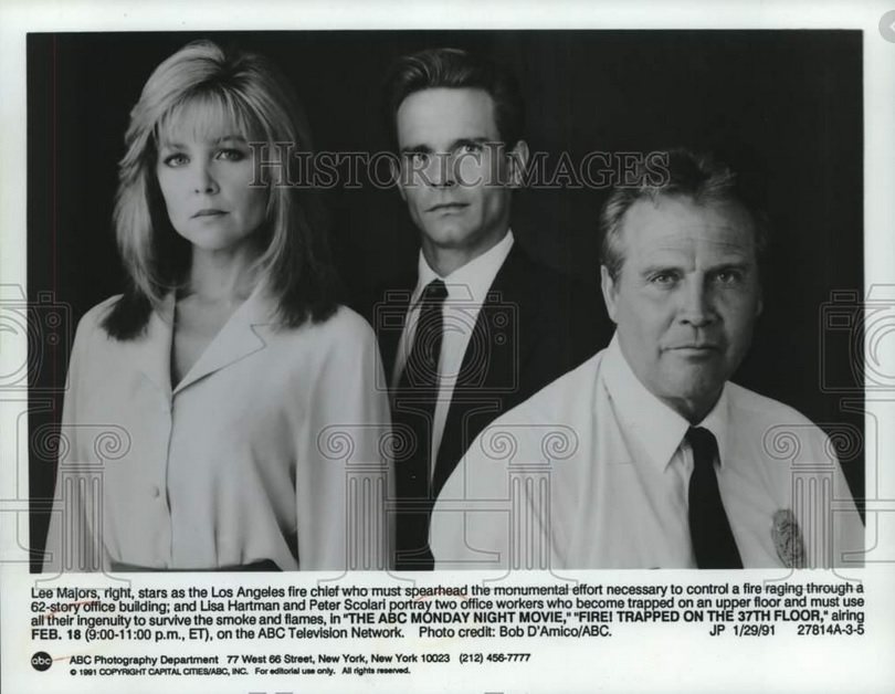 Of course, as with any TV film based on “real events,” dramatic licenses are taken with incidents tweaked and buoyed by composite and fictitious character creations. To that end we have familiar ’80’s TV actors Lisa Hartman and Peter Scolari as two trapped survivors on the 37th floor. Keener TV eyes will pick up on the somewhat lesser known, ’80s small screen stars in the fire brigade with Paul Linke (CHiPs), Ronald William Lawerence (Hunter), John Laughlin (The White Shadow), and yes, that’s the always great Micheal Beach, aka Taddarius Orwell ‘T.O.’ Cross from FX’s Sons of Anarchy, just starting out his long TV career and on his way to recurring roles in Under Suspicion, ER, and Third Watch, but these days, you know his work in The 100 and Chicago P.D. Also look out for a young Angela Bassett just starting her career with support roles in various TV series and telefilms. Lee Majors heads the cast (but everyone else is here a bit more than him), as Sterling, the stoic, no nonsense Deputy Fire Chief working against the endless array of errors exacerbating the tragedy.