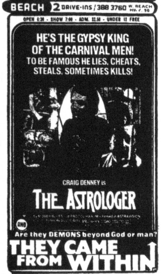 According to Matchbook Cine Club, the man behind all of this, Craig Denney grew up rich in Canada — maybe — and was such a devotee to numerology that he refused to ever reveal his birthdate*. He was kicked out of every school he attended and fired from every radio station he worked at as a top 40 DJ, then went into the “astrological charts business” with his company Moonhouse. Working for individuals and corporations, Denney would use computers to create detailed astrological charts that portended to their future. By 1975, he’d made $31 million and became one of the youngest studio heads in Hollywood history.