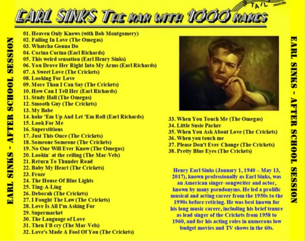 And, in a real treat, there’s a You Tube upload of the Earl Sinks compilation tribute CD The Man with 1000 Names — a super-fine, hour and a half of music featuring his work under the names Sinks, Earl Henry, Sinx Mitchell, and Earl Richards, as well as his work with the Omegas, the Hollidays, the Mar-Vels, and the Crickets. Embedded below, there’s a wonderful slideshow with Earl and the Crickets to the tune of their lost ’50s hit, “Someone, Someone,” to enjoy.