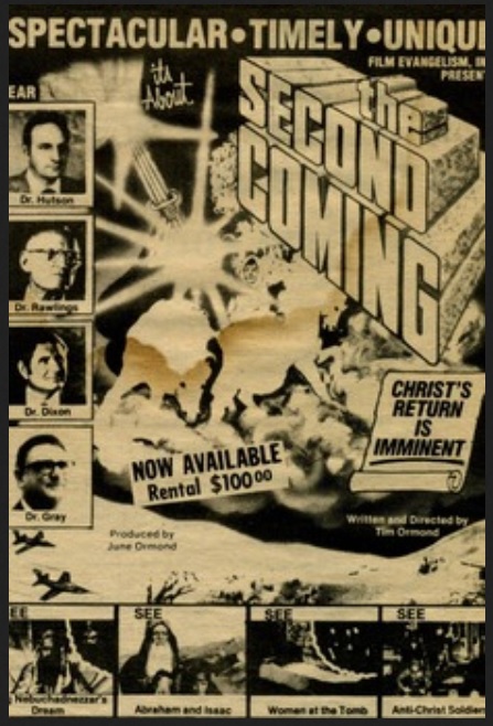 Out of the Ormond’s six Fundamentalist films — seven, if one includes their also-lost, hour-long “travelogue/documentary” feature, The Land Where Jesus Walked (1975) — this is the one film (two, including Land) that is not available as a vintage-resale VHS or reissues DVD. As with all of Ron Ormond’s post-salvation catalogue, The Second Coming did not play in rural Drive-Ins or indoor theaters: it was “rented out” (in this case: $100 a showing, as per the one-sheet) as a “roadshow feature” in churches and tent revivals.