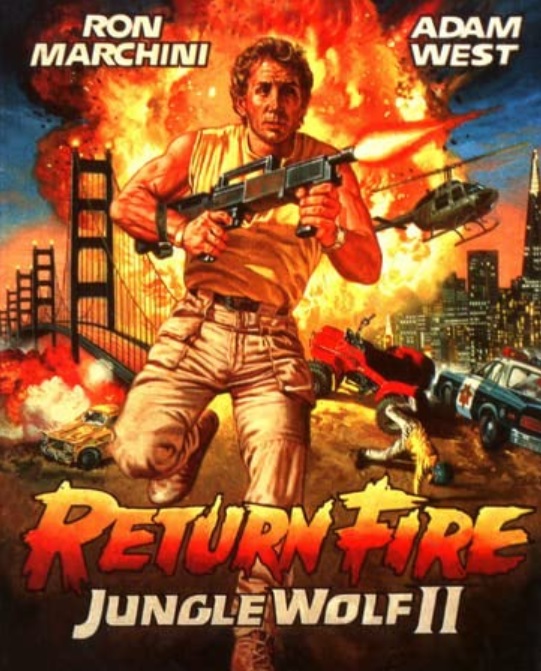 Anyway, if you missed those not to worry: Return Fire, aka Jungle Wolf II, brings us to speed with “flashbacks” from those missions undertaken in ’86s Forgotten Warrior and Jungle Wolf — at least this film, unlike most of the low-budget Philippines’-produced potboilers, admits to their stock footage raiding of both films in the end credits (and don’t forget: the Philippines double as Central America in these films). And speaking of credits: In the opening titles, we learn Return Fire was made by AIP Studios . . . what the . . . the same AIP, aka Action International Pictures, run by David Winters and David A. Prior of Space Mutiny, Future Force, and Future Zone fame? Your guess is as good as ours . . . we dare to dream.