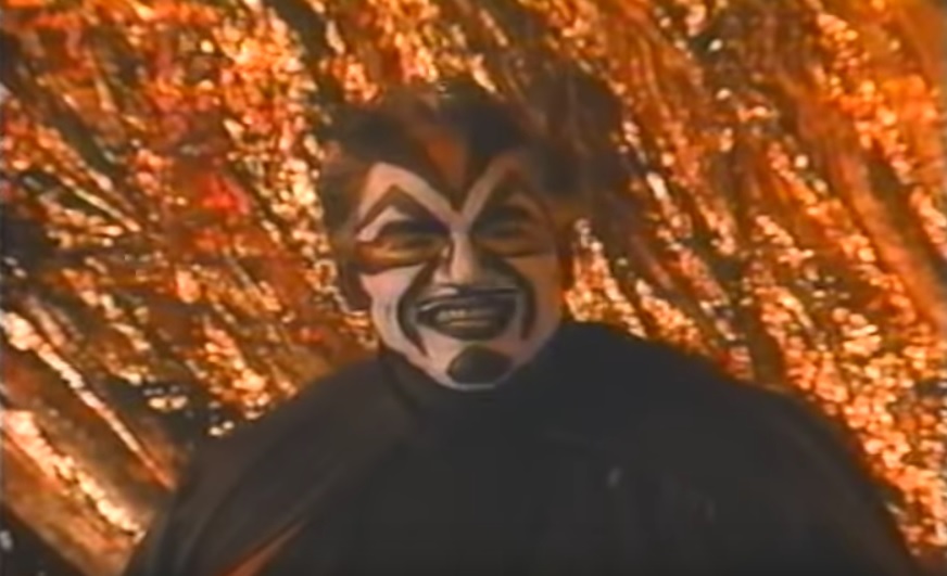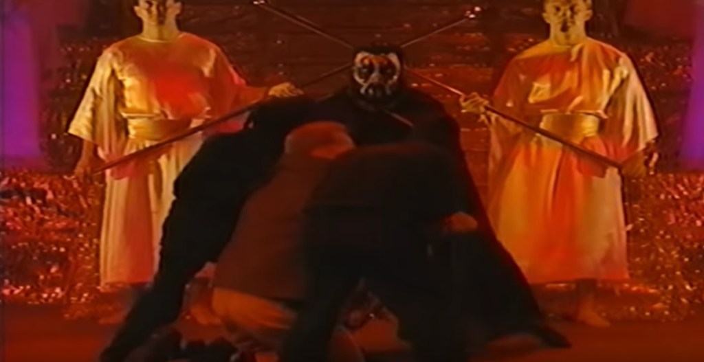 The caveat: The uploads are of two, different productions of the same play. In my opinion, the first version (with faux-King Diamond) — the one I watched on tape all those years ago, is the stronger production of the two. The second version (with Gene Simmons; the second still, above) — which I didn’t know existed until this review — runs a bit longer at 90 minutes, due to it having more Pastor preaching than the first.