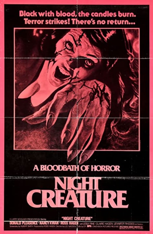 Yeah, in the tradition of William Girdler’s Grizzly, we sort have a Jaws ripoff, here, or as we like to say, a “Bastard Pups of Jaws,” with a killer leopard on the loose, gnawing its way through its cast . . . like one of those killer dog flicks (which we explore in full, with our “Ten Horror Movie Dogs” feature) starring Joe Don Baker, David McCallum, and Richard Crenna. Yep. Just like a William Girdler flick — be it Grizzly . . . or Abby or Project: Kill or Day of the Animals or, hell, The Manitou, which, even though it’s based on a best-selling novel, is still a cash-in on The Omen — Night Creature, aka the poor leopard who was captured by ol’ Donnie and dumped here, doesn’t have an original spot on its hide.