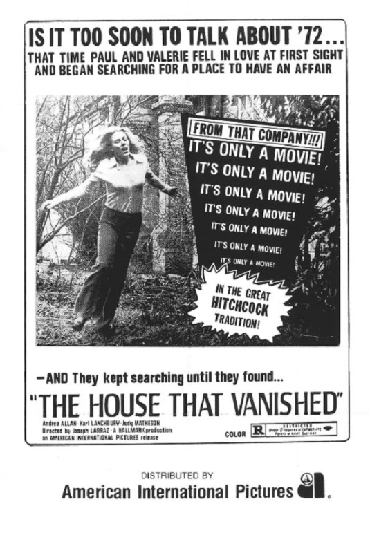 In Larraz’s case, the marketing fared even worse because, not only is The House That Vanished not a gory, Italian-styled giallo nor a graphic, rape-revenge exploitation film: it’s a psychological, supernatural ghost story, akin to his previous work, Symptoms. But a buck is a buck, so drive-in audiences were duped by a theatrical one-sheet that mocked Wes Craven’s The Last House on the Left — complete with its infamous “It’s Only a Movie” tagline.