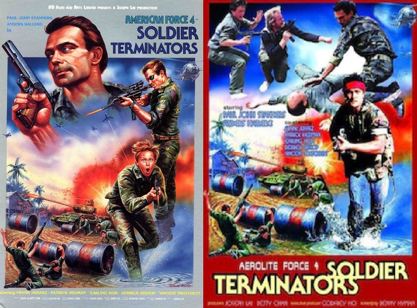 Leave it to Godfrey Ho to mash-up Sly Stallone and Arnie Schwarzenegger into one film. But not First Blood and Commando: Rambo and The Terminator. Only one problem. Well, there’s more than one problem with this film, but the main one: there’s no “Terminators,” as you know them, in this film. Luckily, Godfrey didn’t put a robot on the cover to frack with us. Sorry to slag ya’, Godfrey, but you are the Pacific Rim exploitation king that out-cheaps the crowned King we hail that is Cirio H. Santiago.