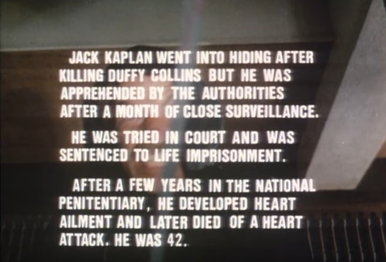 So, Kaplan’s rescued from a Southeast Asian POW camp. But he returns to the States to find his wife Diane missing. And he comes to discover that Duffy Collins, a local gangster, kidnapped and murdered Diane after she rejected his need to rape her. And Kaplan — with a souped-up junk yard set of wheels, along with his crossbow-shotgun-bazooka armament thingy he patched together — goes after Duffy.