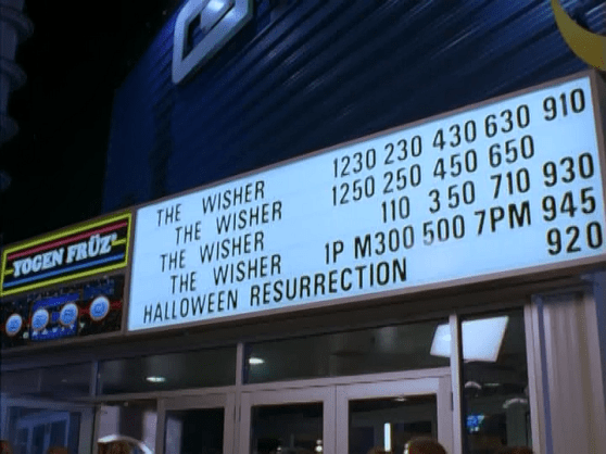 The Wisher is such a big deal that it’s the only movie playing at the theater, except for Halloween Resurrection. Then, this gets down to subliminal messages within movies, early 2000s film piracy and the goofy Wisher showing up in the woods. It even has a post-story stinger where the lead’s little sister decides to watch The Wisher on cable — I would watch it, I mean, it has a tree kill a man — and then The Wisher — who this movie just Scooby-Doo explained away — is sitting on the couch next to her.