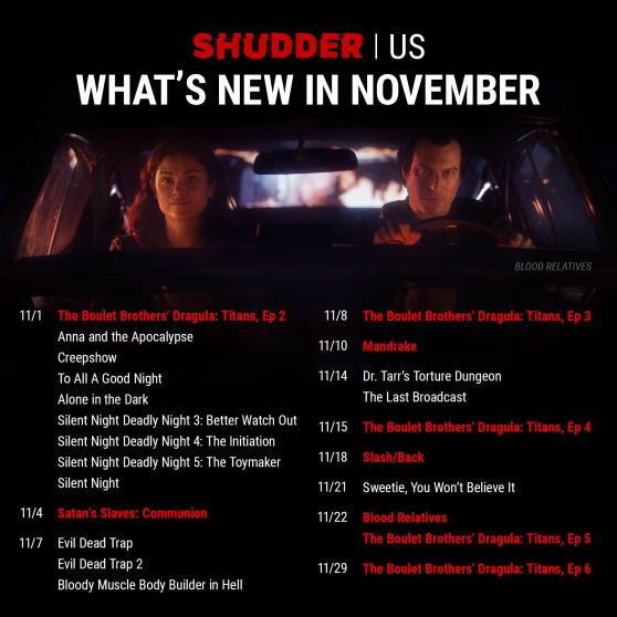 November 1: Anna and the Apocalypse, Creepshow, To All a Good Night, Alone in the Dark, Silent Night Deadly Night 3, Silent Night Deadly Night 4, Silent Night Deadly Night 5, Silent Nights.