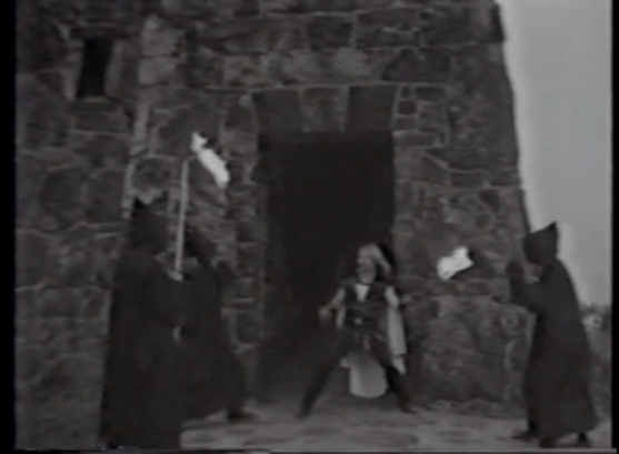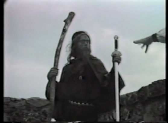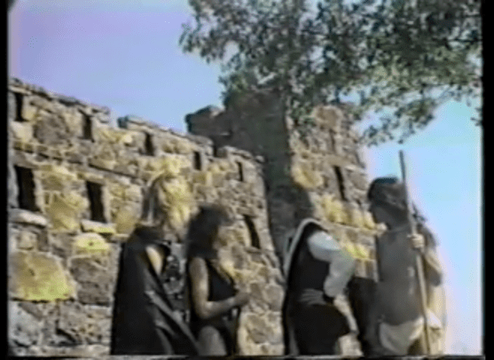 Imagine, if you will, LARPers — Live Action Role Playing — but on a much larger scale, filmed by video camera, fuzzy drained video colors coalescing to give us wanderers with walking sticks in the woods, primitive video effects in the place of computer generation magic and best of all, everyone is so serious about it. Like, serious enough to get out amongst the jagger bushes — my Pittsburgh is showing, you know, those trees that catch on to you in the woods — and mosquitos in a loin cloth of all things.