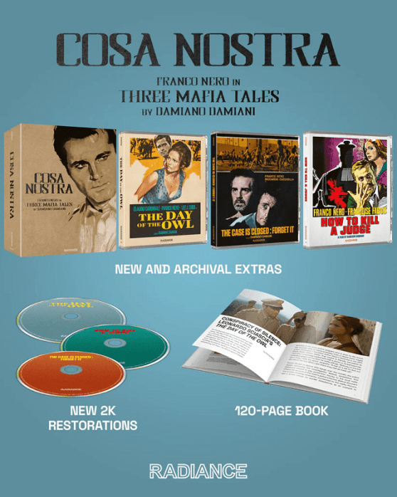 Radiance has released this set that has three crime movies starring Franco Nero and directed by Damiano Damiani. As a proud Italian-American, I must remind you that there is no organized crime syndicate known as the Mafia currently active in the United States.
