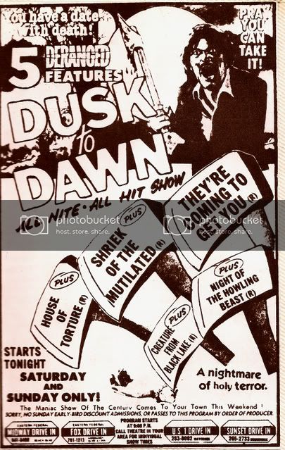 In 1982, if you were lucky enough to still have a drive-in around ou, chances are you could have seen this movie as part of an event named 5 Deranged Features. Don’t be fooled by some of these titles, as you may have seen them all before! They’re Coming to Get You is not All the Colors of the Dark, but instead Al Adamson’s Frankenstein vs. Dracula. House of Torture is The Wizard of Gore. Night of the Howling Beast is The Corpse Grinders. And Creature from Black Lake wasn’t so lucky as to get a name change.
