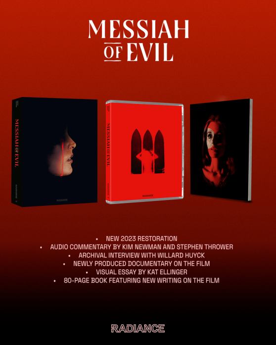 This release also includes an archival interview with co-writer-director Willard Huyck by Mike White from the Projection Booth Podcast; a documentary titled What the Blood Moon Brings: Messiah of Evil, A New American Nightmare that is co-directed by Dima Ballin and Kat Ellinger and has appearances by Alexandra Heller-Nicholas, Maitland McDonagh, Guy Adams, Mikel Koven and David Huckvale; and a visual essay by Ellinger on American Gothic and female hysteria.