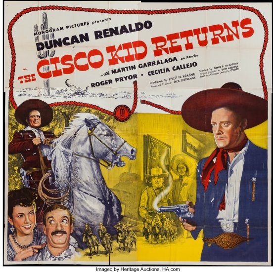 The last film of director John P. McCarthy, this is not the first Cisco Kid movie. 1914’s The Caballero’s Way is the original film, starring William R. Dunn. Vester Pegg was Cisco in a 1919 film, then Warner Baxter took over the role in five films between 1928 and 1939, even winning a Best Actor Academy Award for In Old Arizona. Caesar Romero also was Cisco in six films from 1939 through 1941.