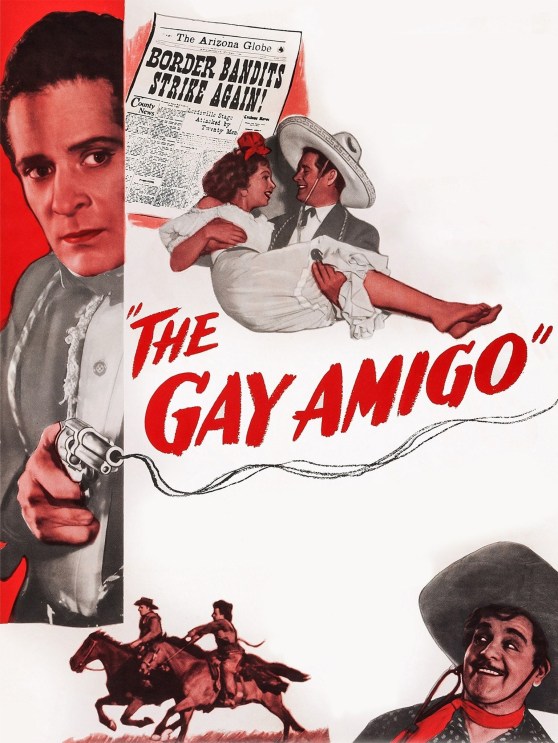 The Gay Amigo: Cisco (Duncan Renaldo) and Pancho (Leo Carillo) are at the border of Arizona and Mexico when they see the U.S. Cavalry pursuing some Mexico bandits. As they get to Mexico themselves, they see a bandido fall off his horse, dead. What’s strange is that the Mexican criminal is really an American soldier all dressed up.