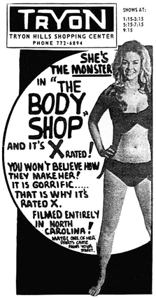 Yet it’s his vanity production — in the best sense of the word — The Body Shop that we’ll be talking about today. In addition to directing, writing and producing this movie, Patterson was also its lead, playing Dr. Brandon. He’s lost his wife in a car crash — shades of The Brain That Wouldn’t Die — so after setting her head ablaze, he decides to just remake her in a perfect body by killing women — again, The Brain That Wouldn’t Die — along with his hunchbacked assistant Greg (Roy Mehaffey).
