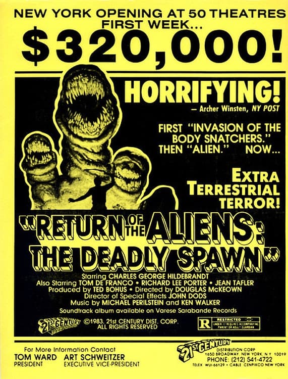 Also known as Return of the Aliens: The Deadly Spawn or The Return of the Alien’s Deadly Spawn to cash in on Alien, it was co-written by director/screenwriter Douglas McKeown and producer Ted Bohus (John Dods and Tim Sullivan are also credited).