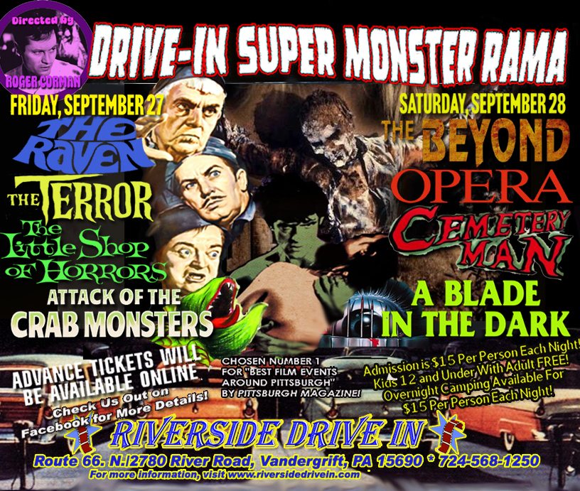 September Drive-In Super Monster-Rama is back at The Riverside Drive-In Theatre in Vandergrift, PA on September 27 and 28, 2024. Admission is still only $15 per person each night (children 12 and under free with adult) and overnight camping is available (breakfast included) for an additional $15 per person. You can buy tickets at the show but get there early and learn more here.