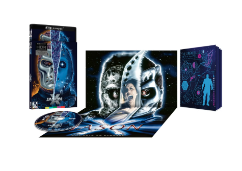 The Arrow Video UHD release of Jason X has an introduction to the film by Kane Hodder, three audio commentaries (film historians Michael Felsher and Steve “Uncle Creepy” Barton; writer Todd Farmer and author Peter Bracke; director Jim Isaac, writer Todd Farmer and producer Noel Cunningham), an interview with Harry Manfredini, a making of, archival interviews with Farmer and actor Kristi Angus, archival docs on the history of the character and the making of the movie, cast and crew interviews, behind the scenes footage, an electronic press kit, trailers and TV commercials and stills, behind the scenes and poster galleries, all inside a reversible sleeve featuring original and newly commissioned artwork by Gary Pullin with a double-sided foldout poster featuring original and newly commissioned artwork by Gary Pullin and an illustrated collector’s booklet featuring new writing on the film by Matt Donato and JA Kerswell. You can get it from MVD.