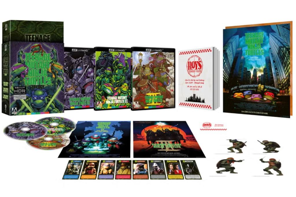 The Arrow Video release of these movies has brand new 4K restorations of all three films by Arrow Films; a perfect bound collector’s booklet in the style of a Roy’s Pizza menu, featuring new writing on the movie by Simon Ward, John Torrani and John Walsh; reversible sleeves featuring original and newly commissioned artwork by Matt Frank and Roberto Rivera Padro; a double-sided foldout poster featuring original artwork from Teenage Mutant Ninja Turtles and the “Map of the Kappa Realm”, a stylised re-creation of the ancient scroll that appears in Teenage Mutant Ninja Turtles III; two additional double-sided foldout posters featuring original and newly commissioned artwork by Matt Frank and Roberto Rivera Padro; eight character trading cards; a Roy’s Pizza loyalty card and four character stickers.
