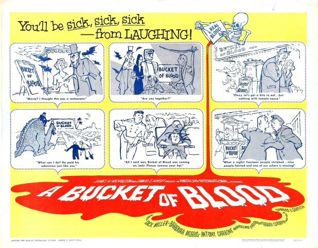 A Bucket of Blood aspires to art as much as it does junk. Written by Charles B. Griffith, whose name you can associate with films as disparate as Smokey Bites the Dust, Barbarella and Death Race 2000, it’s a tale of trying to figure out how to create art when all you can do is repeat words and images. Maybe that’s what art really is.