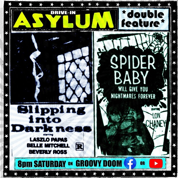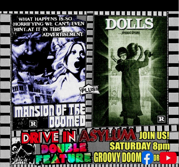 Bill and I are back this Saturday at 8 PM EST on the Groovy Doom Facebook and YouTube pages. This week — you can win DVDs from my collection! Every week, we watch two movies, discuss them with you, share drink recipes, view an ad gallery and have our infamous third segment where anything can happen.